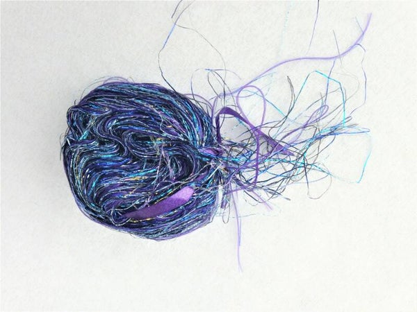 - Novelty sparkly, glittery fine fibres with a very fine purple and grey support yarn.