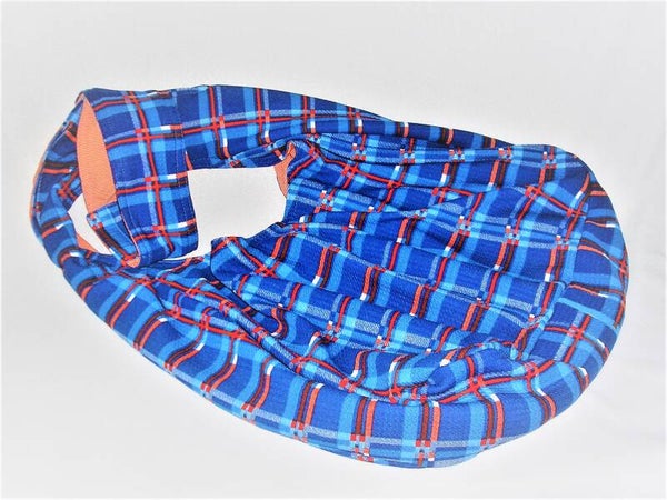 - BLUE checks/tartan/stripes with Orange accents fabric, fully lined, one strap over shoulder bag