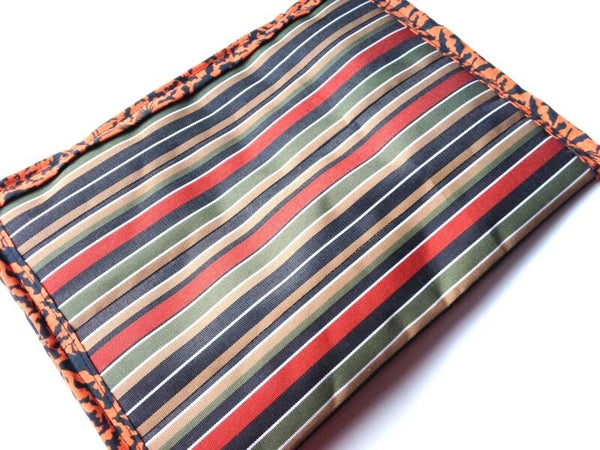 - GREEN, RUST, BEIGE, CREAM, BLACK, WHITE horizontal stripes.