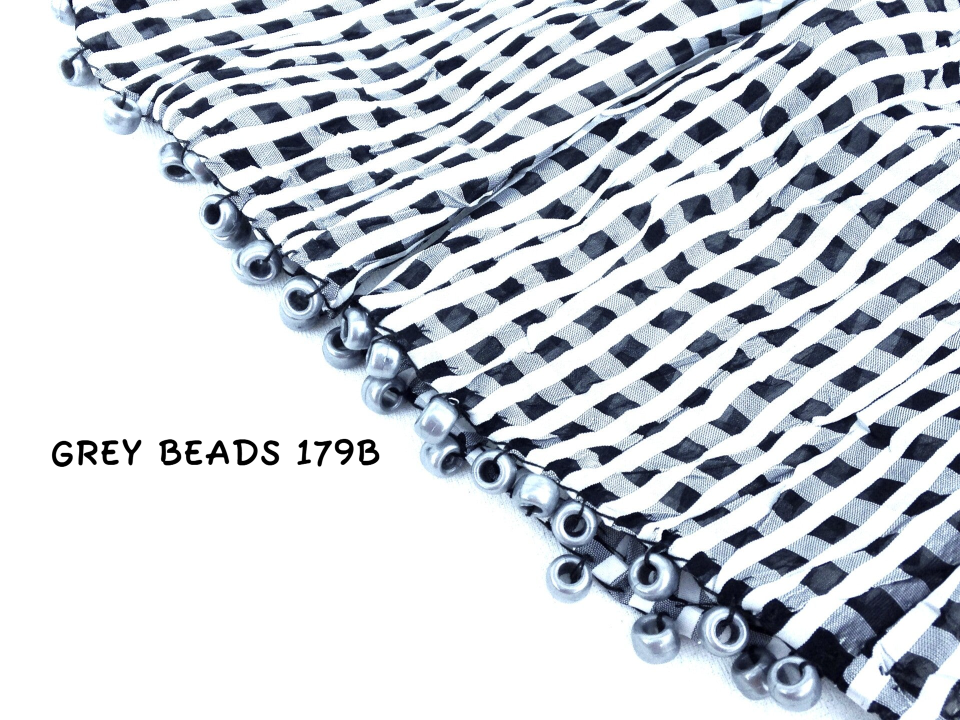 - Open ends, hemmed and embellished with a small fringe of pony beads in black 179A , AS or grey 179B