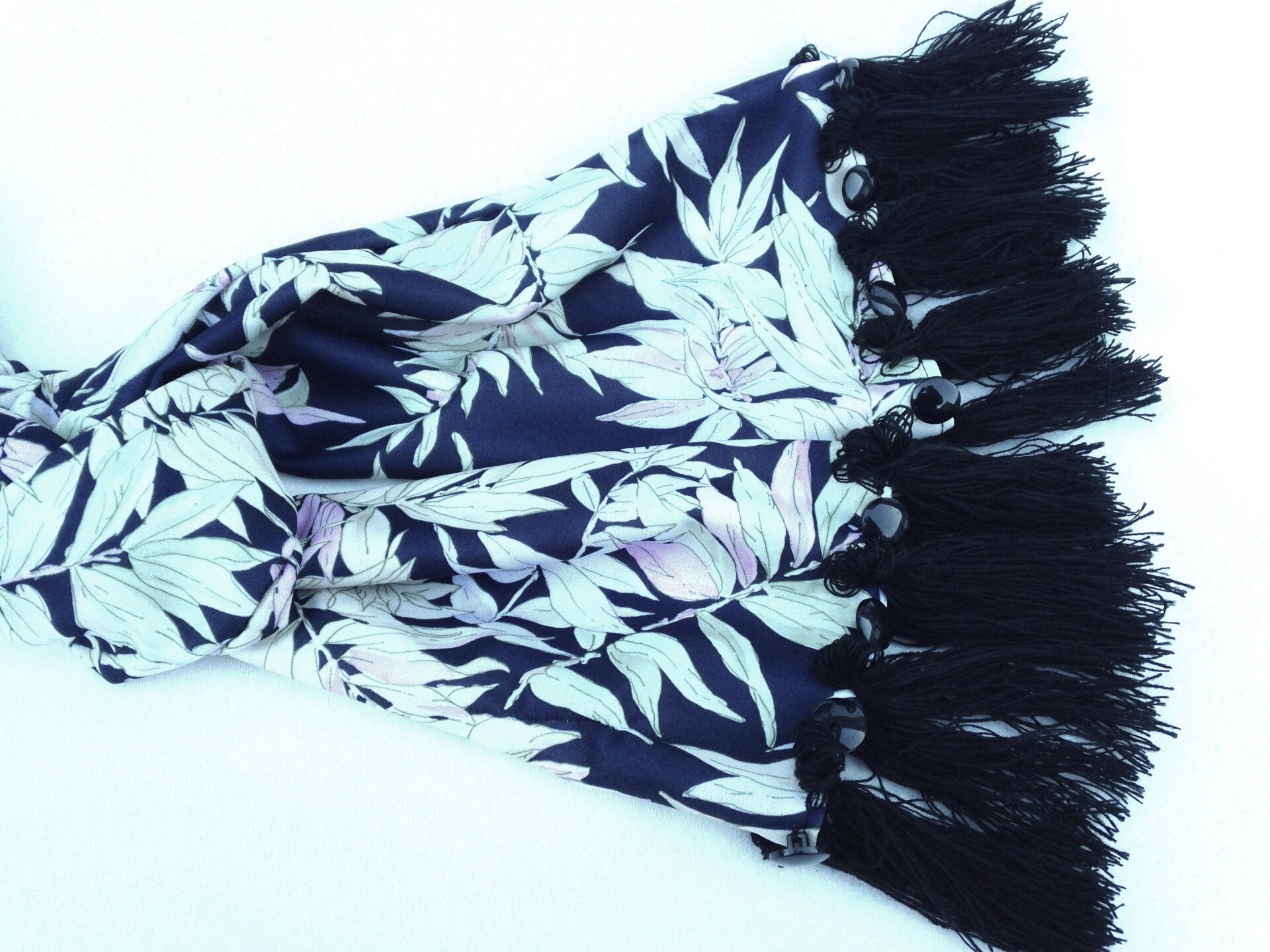 - Open hemmed ends with black acrylic fine yarn tassels and black button embellishment. Fringe 8cms
