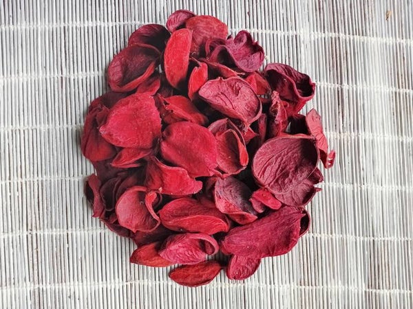 - Dried single sepal/seed pod cases, fully dried and dyed deep crimsom