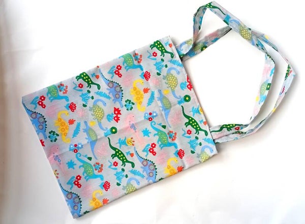 - SMALL Tote style bags with novelty, children's theme fabric designs for use as light weight capacity shopping bags, party gift bags or book bags for library and bedtime books.
