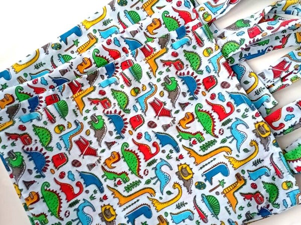 - SMALL Tote style bags with novelty, children's theme fabric designs for use as light weight capacity shopping bags, party gift bags or book bags for library and bedtime books.