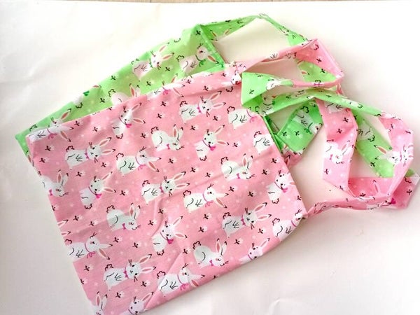 - WHITE RABBITS on SALMON PINK and LIGHT MINT GREEN backgrounds. Each bag has pink on one side and green on the other. Similarly carrying handles/shoulder straps are in the 2 colours too.
