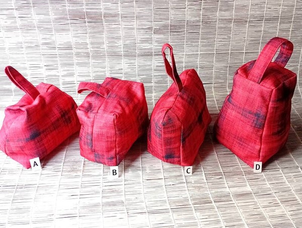 DOORSTOPS in an abstract RED with GREY patterned fabric.