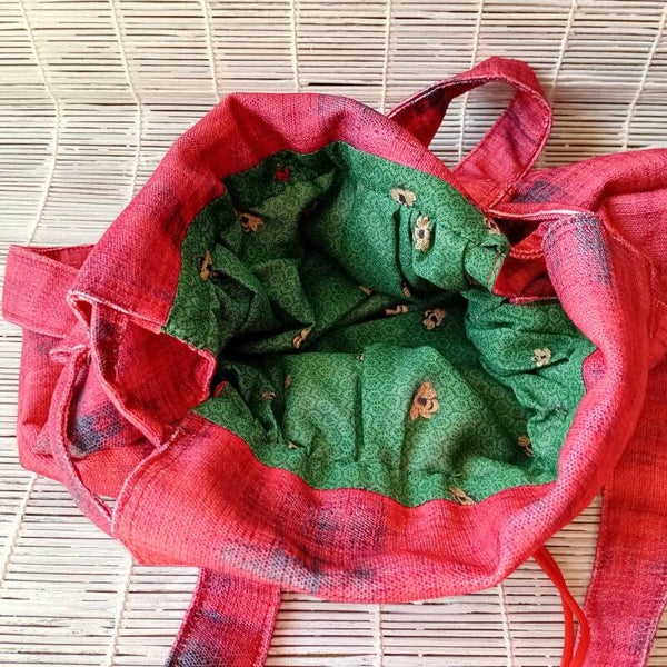 - Rounded, blousy shape with a fabric top band (depth11cms) and sides open at top side seam to allow the narrow bag top to expand.