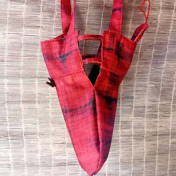 - Hand held, two fabric straps, fabric tab closure with a Red loop over 2 buttons (base button with decorative top button) in black and red.