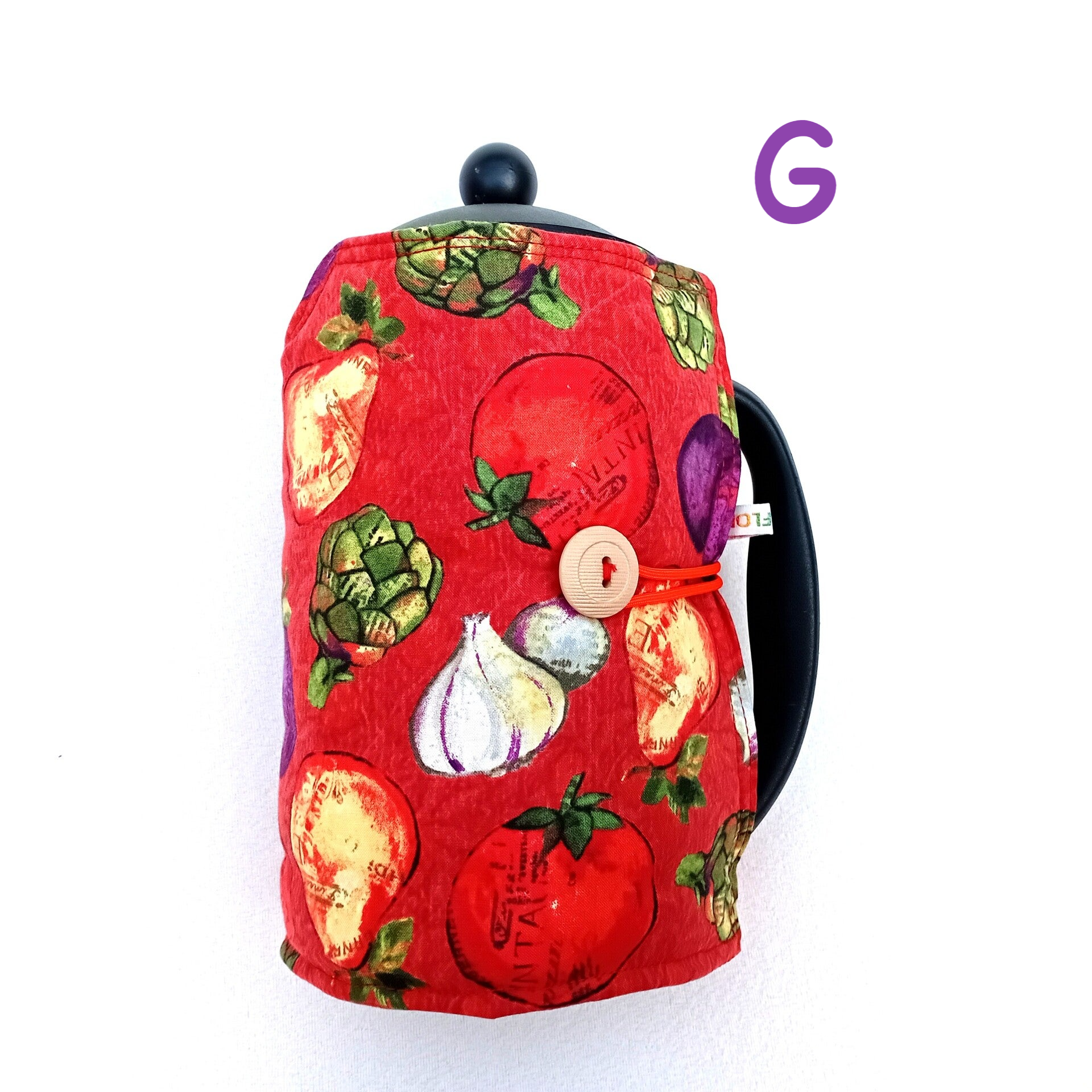 - Cover is held in place round the cafetiere or French press body by orange loops over beige buttons