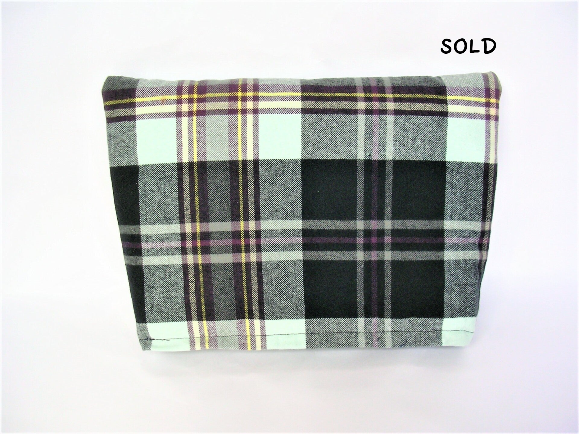 • Black, grey, pale green, purple/yellow stripe tartan,