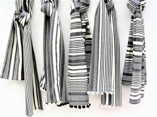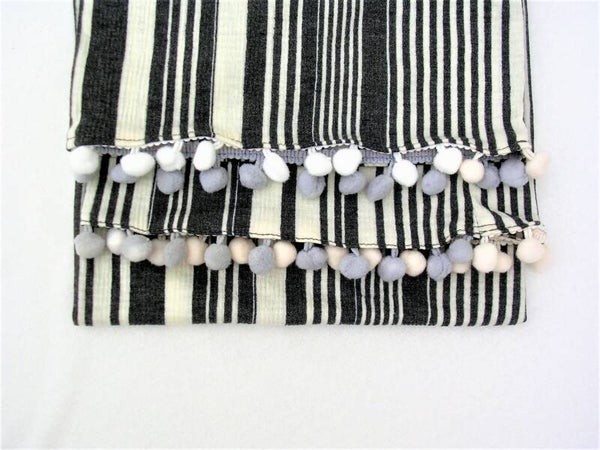 - Grey/Cream scarf also available with or without a narrow Pom-Pom fringe with horizontal stripes.