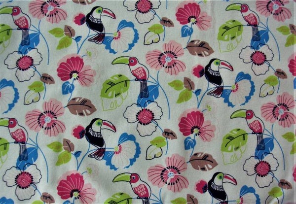 - Contemporary novelty print design of Toucans and flowers.